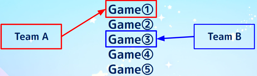 -Teams decide who plays which game internally. For each match, the three games played are: